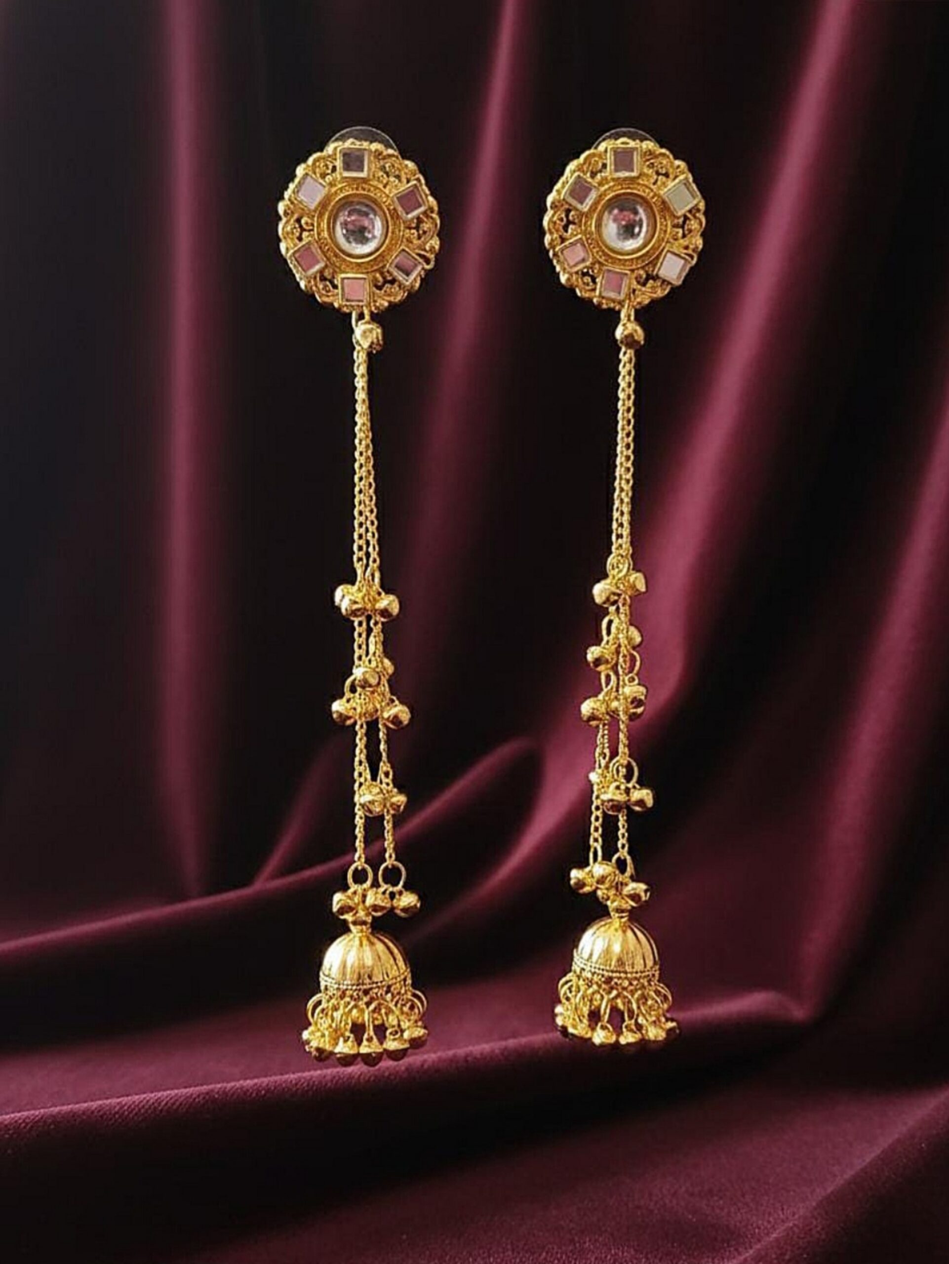 THESE STYLISH AND FANCY KASHMIRI STYLE EARRINGS ALSO KNOWN AS KASHMIRI EARRINGS , DESIGNED WITH BEAUTIFUL LONG HANGING CHAINS AND DETAILED FINISH, THESE EARRINGS DESIGN ARE BEAUTIFUL AND TRENDING